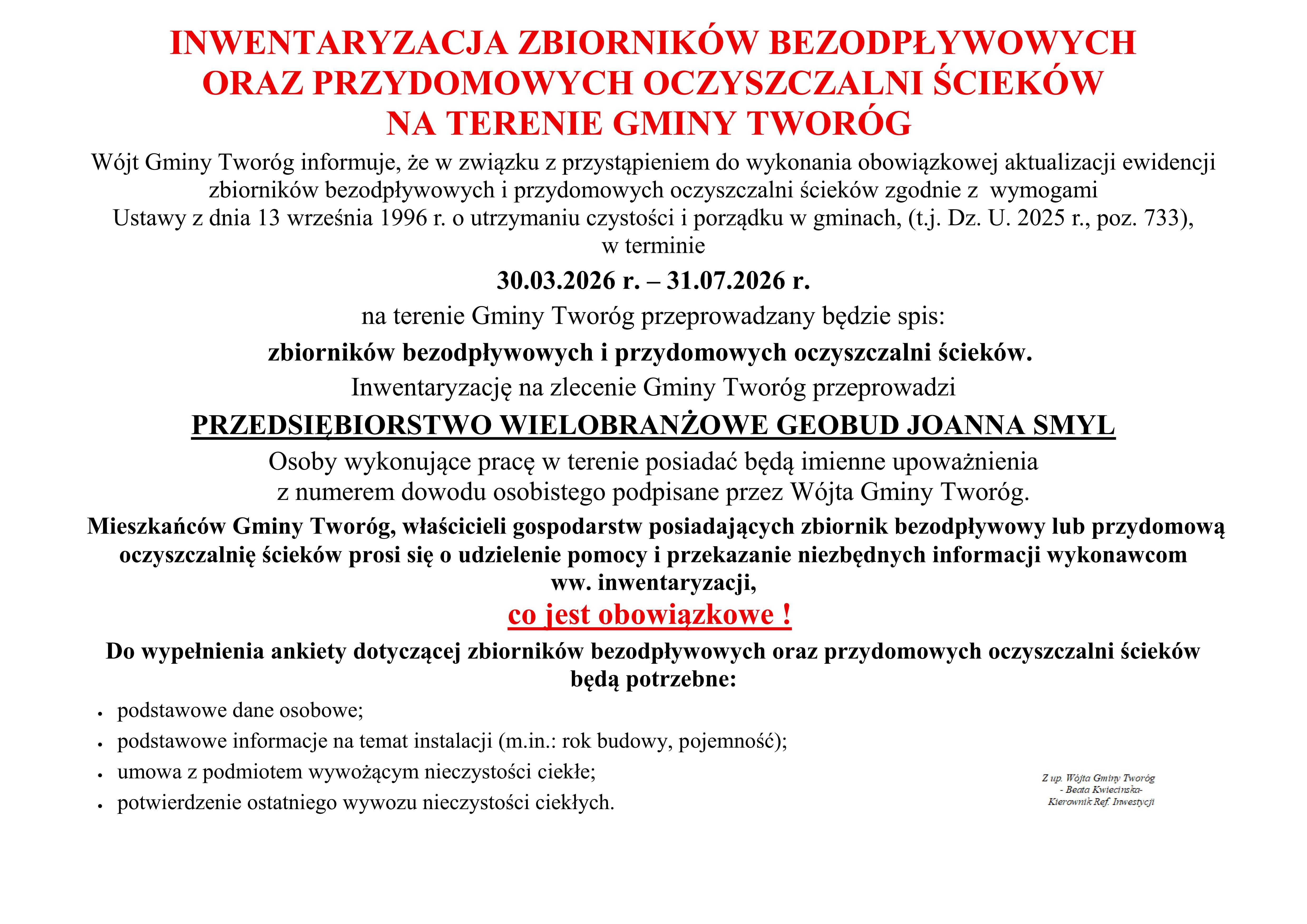 INWENTARYZACJA ZBIORNIKÓW BEZODPŁYWOWYCH ORAZ PRZYDOMOWYCH OCZYSZCZALNI ŚCIEKÓW NA TERENIE GMINY TWORÓG